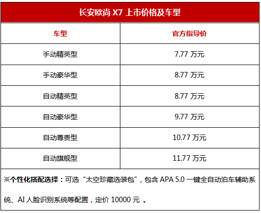 大美都市精品SUV——长安欧尚X7,是长安欧尚汽车打造的中国百姓用得上的精品车,代表了品牌对品质至上的追求,此时在北京人民大会堂上市发布,更是呼应了客户的热切期待。新车推出两款手动挡车型,四款自动挡车型,官方指导价7.77-11.77万元。
