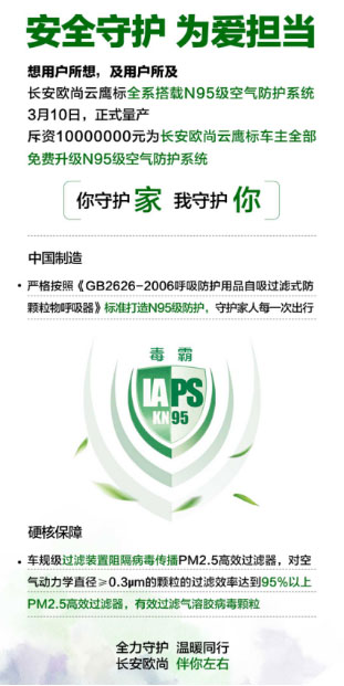 疫情期间,长安欧尚汽车在1月底率先推出 “好车线上定,安全送上门”的7*24小时在线服务响应。客户只需要登陆欧尚Style即可全时满足选、购、用、换、修等整套用车服务。为用户提供安心、便捷、高效的服务。此外,长安欧尚汽车还发布复工五大举措,斥资1000万研发量产达到N95级空气防护效果的IAPS智能活性滤净系统,计划3月10日量产后将为2018年后销售的长安欧尚汽车云标系车型免费升级。