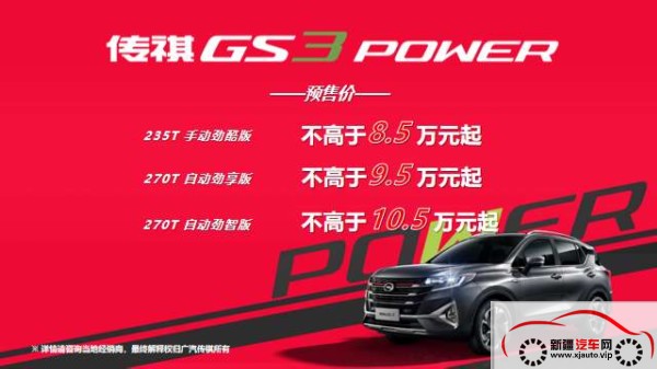劲擎品鉴,劲享钜惠。传祺GS3 POWER 颜智超群的实力,势必让你一见钟情,多重钜惠豪礼不断,您还在等什么?感兴趣的朋友们,可详询当地经销商,获取更多活动及车型信息。