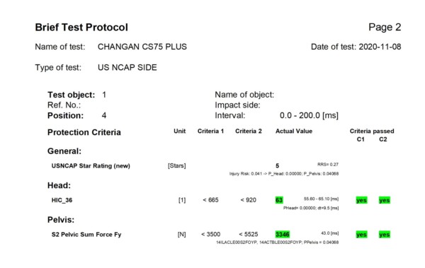 具体来看,CS75PLUS前排乘员头部HIC才20,受到重伤或者死亡的概率小于0.01%,后排乘员头部HIC才63,受到重伤或者死亡的概率也小于0.01%。按照U.S.NCAP假人头部伤害评价(HIC),一般认为HIC超过650就会有较大概率发生伤亡。