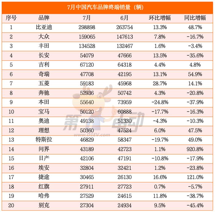7月终端销量(上险量)数据显示,比亚迪以近30万辆的终端销量,创历史新高,稳居销冠宝座,紧随其后的依旧是大众和丰田。