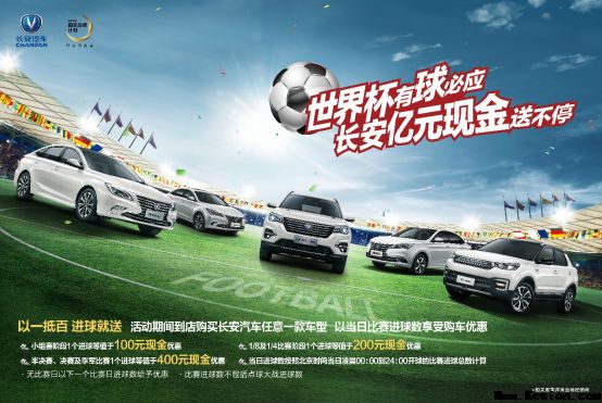 除五重好礼之外,长安汽车更为火热的球赛再添一份激情,运动期间,到店购买长安汽车任一款车型,以当日比赛进球数享受购车优惠,小组赛阶段1个进球等值于100元现金优惠,1/8及1/4比赛阶段1个进球等值于200元现金优惠,半决赛、决赛及季军比赛1个进球等值于400元现金优惠。