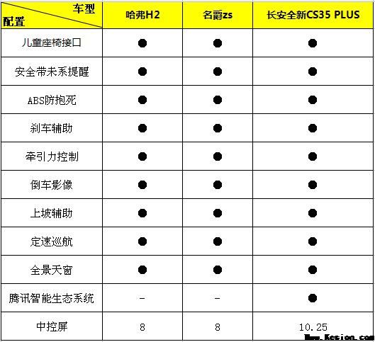 从配置上看,哈弗H2和名爵zs顶配车型都拥有儿童座椅接口、安全带未系提示、ABS防抱死、刹车辅助、牵引力控制、倒车影像、上坡辅助、定速巡航、全景天窗等配置。长安全新CS35 PLUS顶配版也拥有以上配置,还在其基础上加了哈弗H2和名爵zs都没有的腾讯车联智能生态体系。
