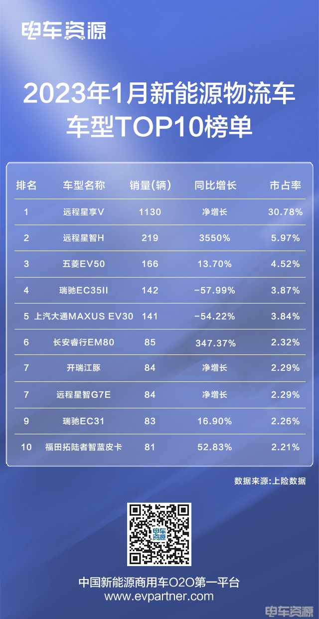 据电车资源统计,2023年1月,我国新能源物流车销量为3671辆(不含交叉型乘用车和物流重卡),同比下降3.75%,多款车型实现正增长。在2023年首月新能源物流车畅销车型TOP10中,远程星享V、开瑞江豚等3款车型实现净增长。与