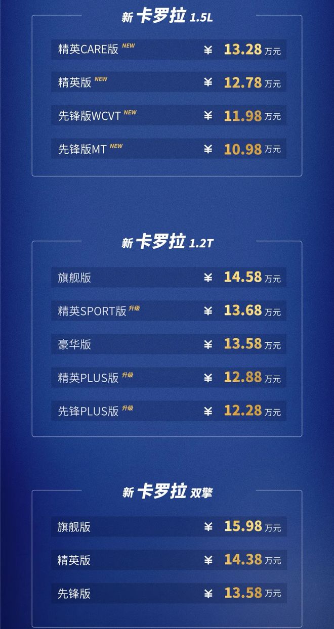 一汽丰田今日宣布,2021款卡罗拉正式上市,其市场指导价为10.98-15.98万元。新车在动力上拥有1.5L、1.2T和混合动力三种,除了动力上的变化之外,新车还在配置上做了一定的升级。