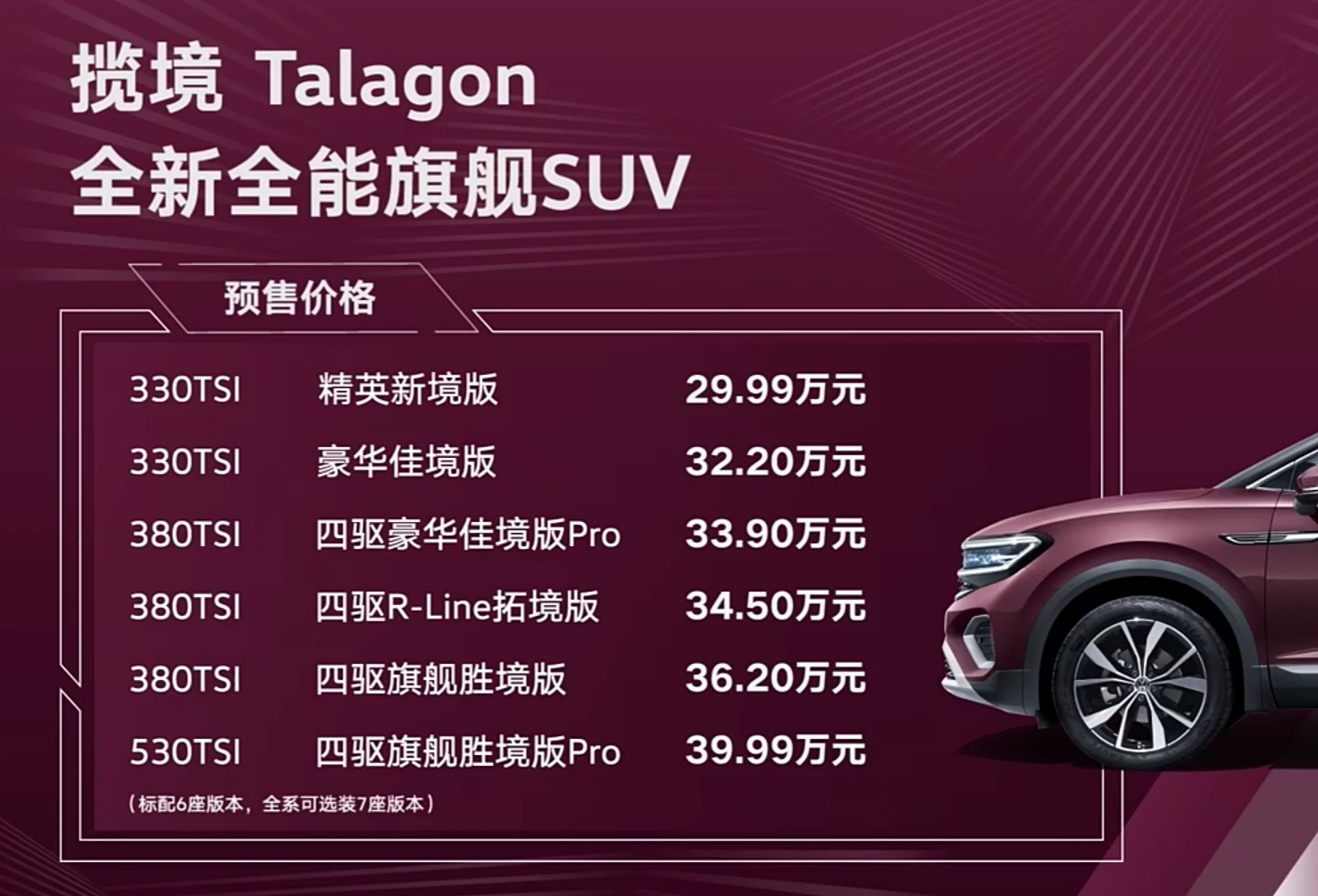 5月22日,一汽-大众揽境正式公布预售价为29.99-39.99万元,新车定位中大型SUV,比同门途昂的尺寸更大,成为大众品牌中最大的SUV车型,新车将于6月24日正式上市。