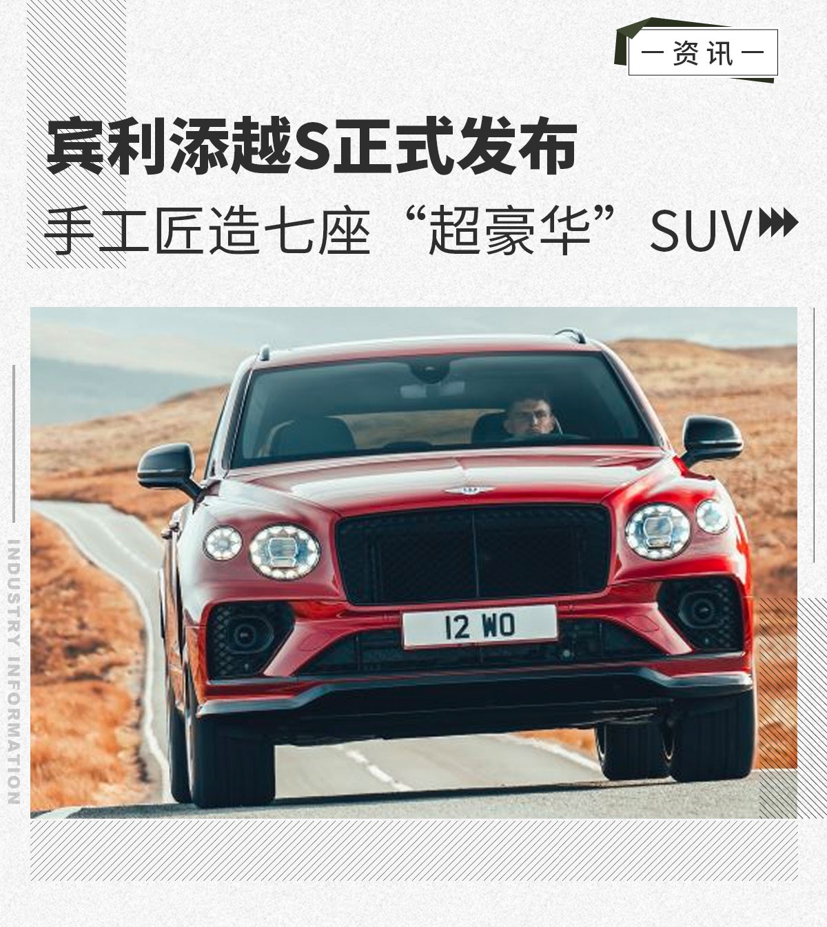 从官方获悉,宾利添越S正式发布。该车加入深色大灯、专属徽标、22英寸轮圈、运动型排气、黑色抛光饰件、黑色外观套件和黑色车门后视镜等,进一步彰显其运动风格。动力方面,宾利添越 S搭载4.0升双涡轮增压V8发动机,并采用独特调教的运动底盘。值得一提的是,这款SUV采用手工匠造,且内饰引入全新配色方案和Alcantara®材质并提供四座、五座和七座可选。