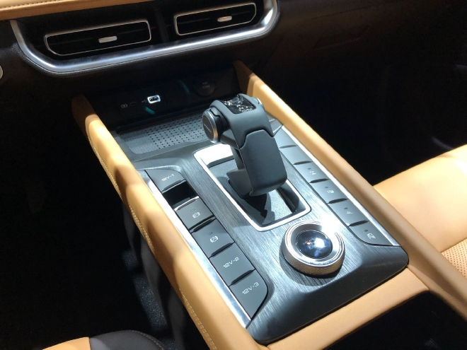 换挡区域也是进行了一些小调整,包括将原本的游艇式挡把换成了现在坦克300上使用的挡把样式,看起来会更有机械美感。两边的按键则是得到了保留,并重新进行了设定,同时前方还添加手机无线充电面板。