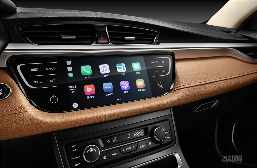 本次发布的内饰部分,新车采用了吉利最新的家族化内饰设计,采用棕色和灰色搭配,中控台由较多的拱形线条构成,以皮质材料包裹,并配备液晶表现屏、三幅式多功能方向盘以及电子手刹等,团体豪华感以及科技感都较为不错。