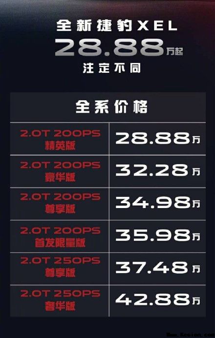 国产奇瑞捷豹XEL正式上市,新车全系搭载2.0T涡轮增压发动机,匹配8速手自一体变速箱,共推出6款车型,售价区间为28.88-42.88万元。