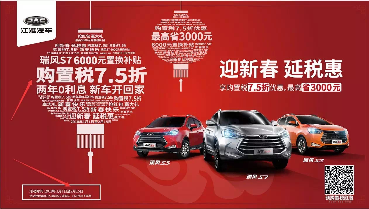 众所周知,2018年国家的购置税补贴政策正式结束。而在2017年,排量1.6L及以下车型享受购置税75%的优惠政策。日前,我们从江淮汽车官方获悉,瑞风S2、瑞风S3、瑞风S7三款车型的1.6L排量及以下车型将享受厂家补贴25%的购置税补贴,因此三款车型的现实购车价格将和2017年保持同等。