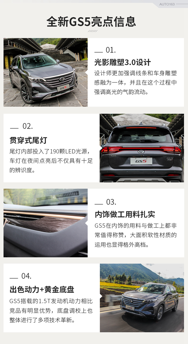 作为定位高于GS4的A+级SUV,全新GS5上市后的竞争对手将瞄准荣威RX5、哈弗F5以及名爵HS等同样主打时尚动感路线的自立品牌中高端SUV。