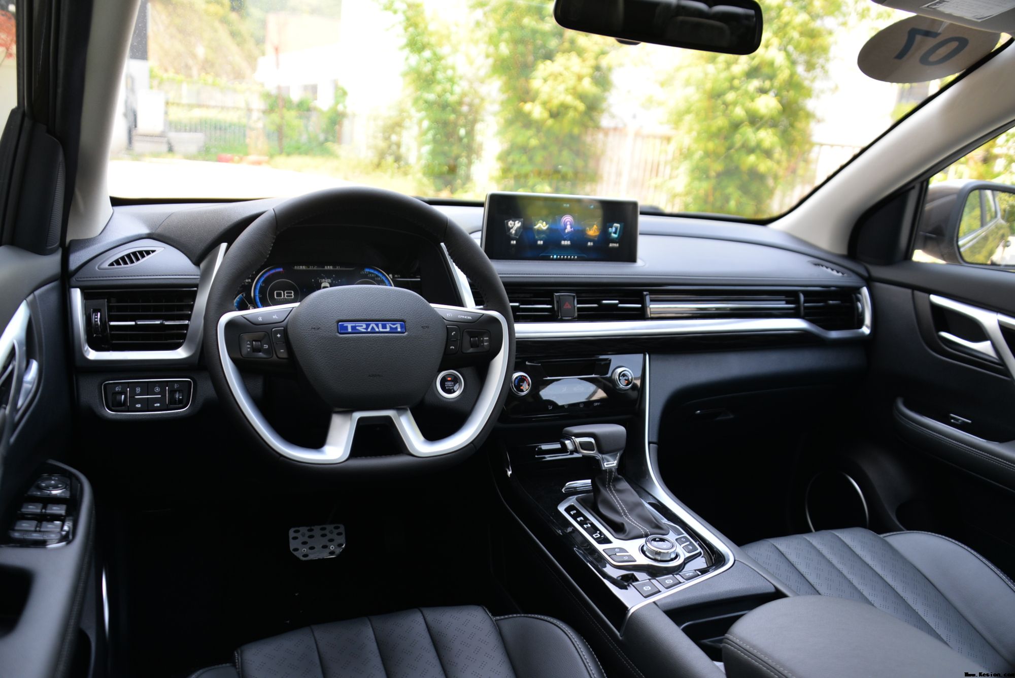 2.仪表台采用一体式风格,从驾驶室横贯至副驾驶室的镀铬银条走线流畅,多功能方向盘四幅设计,配有悬浮式液晶表现屏,变速箱档杆采用直排式飞机造型;